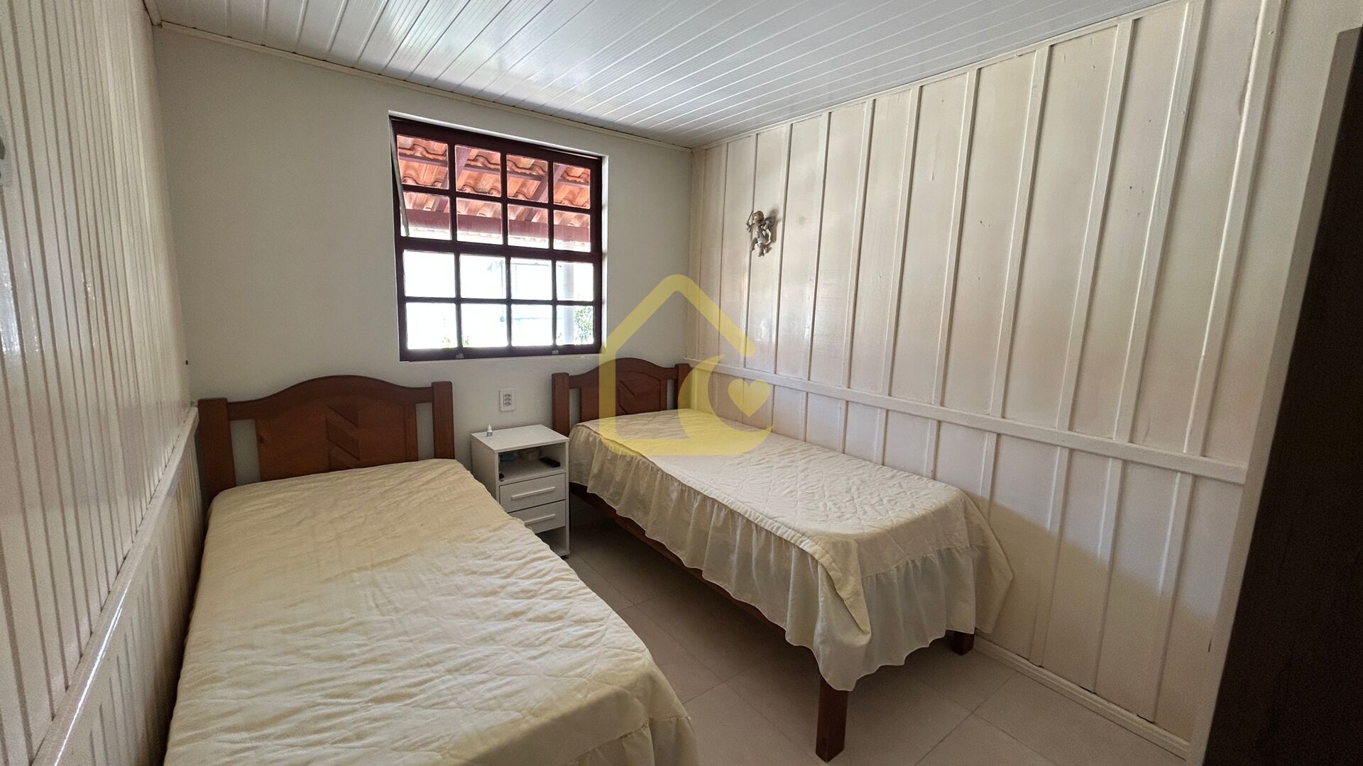 São dois quartos, sala e cozinha conjugada, banheiro social, lavanderia e garagem para dois carros.
